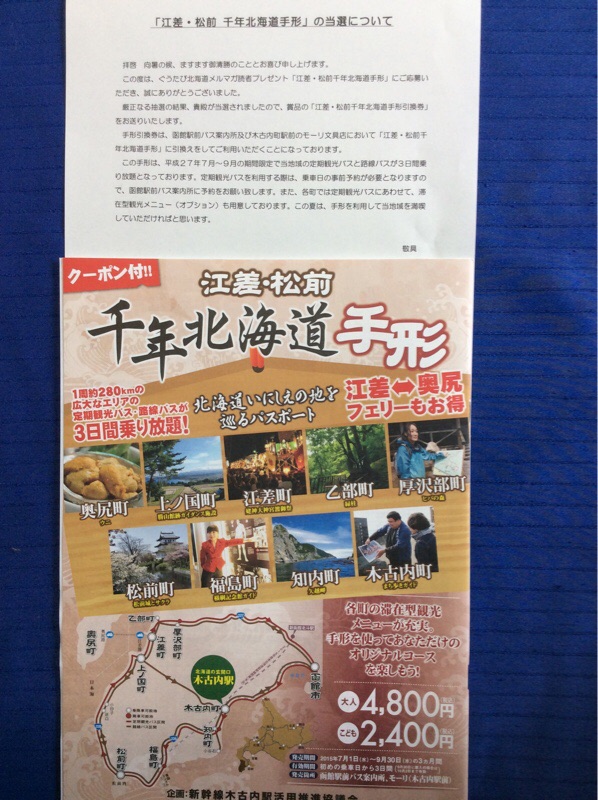 バスの旅が当選しました。私の好きな道南地方です。3日間乗り放題です。この手形を使ってゆっくり旅がしてみたいです。