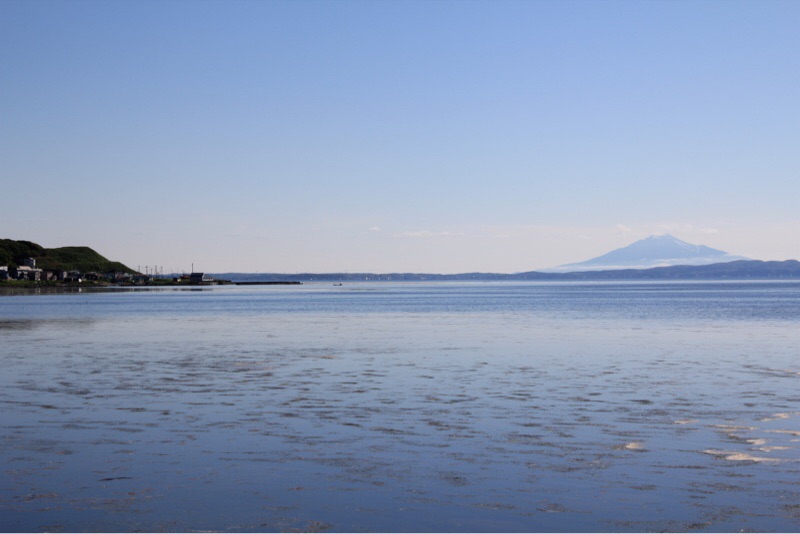 宗谷岬の近くの海で 利尻島の利尻山が見えました。利尻富士と呼ばれる山です。こんなに はっきりと見たのは初めてです。