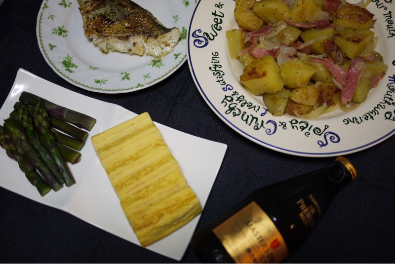 夕ご飯は 鱈のマジックソルト焼き、ジャーマンポテト、パープルアスパラ、玉子焼きです。パープルアスパラは 初めて買いました。電子レンジで加熱したらグリーンに色が変わりました。どんな味かしら?