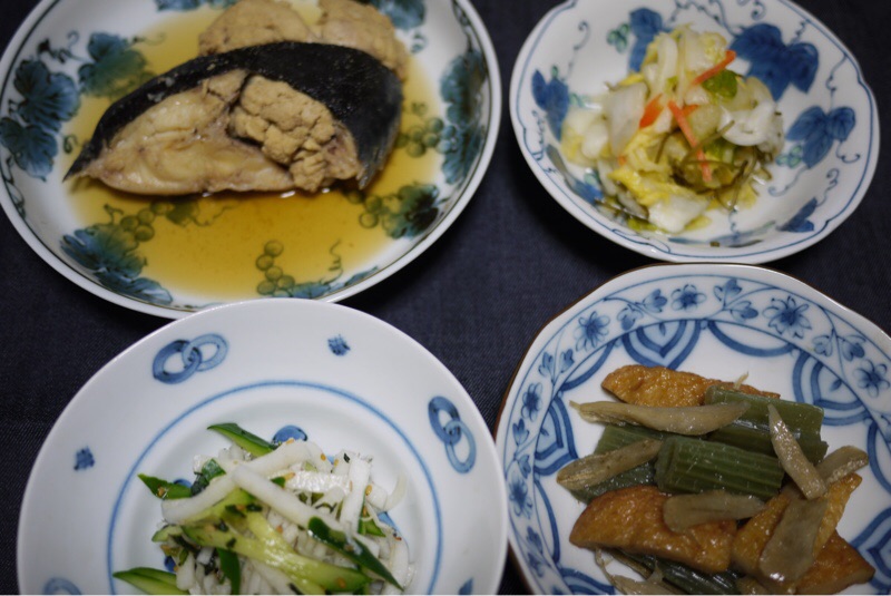 夕ご飯は 根室産 黒ガレイの煮付け、フキとさつま揚げとゴボウの炒め煮、大根と胡瓜と野沢菜ちりめんの酢の物、白菜の浅漬けです。今晩は和食の献立 居酒屋さん 開店です。