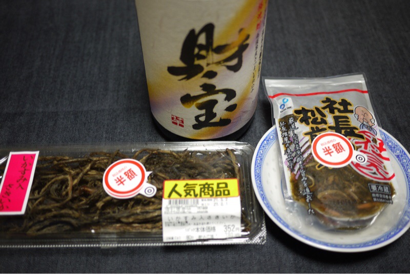 先週 主人が焼酎を買いました。今晩は函館の 半額おつまみの いかすみ入りさきいか 松前漬で 晩酌します。いかすみ入りさきいかは 初めて食べます。どんな味かしら・・・